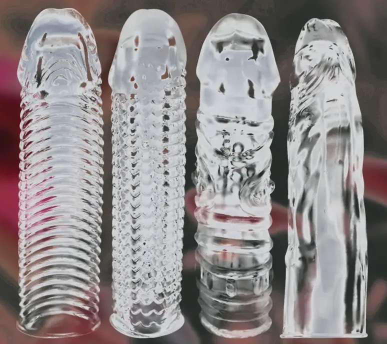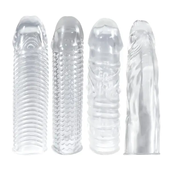 Pack of 4 crystal textured penis sleeves in different shapes and textures for length and girth enhancement